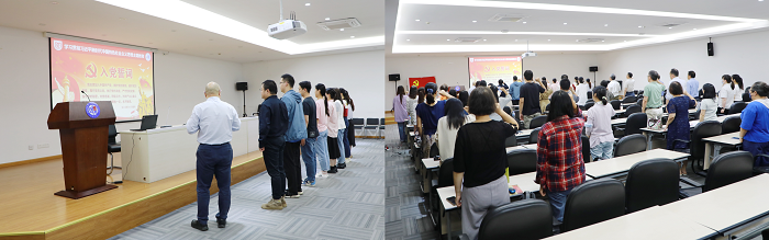接着,范佳君老师作为新党员代表发表入党感言。他表示经过疫情的洗礼,自己对党有了更深刻的认知,也更加坚定了入党初心。作为科研教学一线的青年教师,会自觉担负起科教兴国的使命,向着文化因科教而续,国家因科教而兴,民族因科教而立的方向努力奋进。随后,路若楠同学作为学生代表结合学习贯彻习近平新时代中国特色社会主义思想主题教育发表入党感言,认为要牢牢把握“学思想、强党性、重实践、建新功”的总要求,理论联系实际、理论指导实践,把入党誓词作为自己的崇高追求,毕生修养和终身实践。