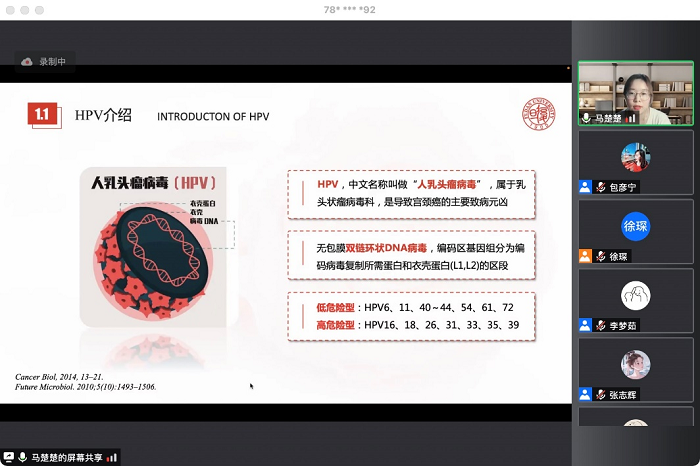 随后比赛开始。入选决赛的10位同学围绕“HPV疫苗的研发进展及品质”这一主题依次展示、讲解自己精心设计的PPT。每位参赛选手发挥自身优势,展示内容丰富准确、讲解过程生动稳健,给在座的评委、老师和同学们带来了一场精彩的视听盛宴。评委团老师也在每位选手展示后分别给予点评。展示环节结束后,杨景瑞校友在发言中表示,感谢51吃瓜 这么多年来对PPT大赛举办的支持,他感慨到“江山代有才人出,长江后浪推前浪”,对10位参赛选手充分的准备和优秀的表现给予了称赞。他鼓励同学们在学习、科研中独立思考,充分发挥自身兴趣和专业特长,并询问关心了各位同学在疫情期间的学习、工作和生活情况。同时,杨景瑞校友期待在下一季的毕凯英才PPT大赛决赛中,能有机会来学校与同学们面对面的交流互动。