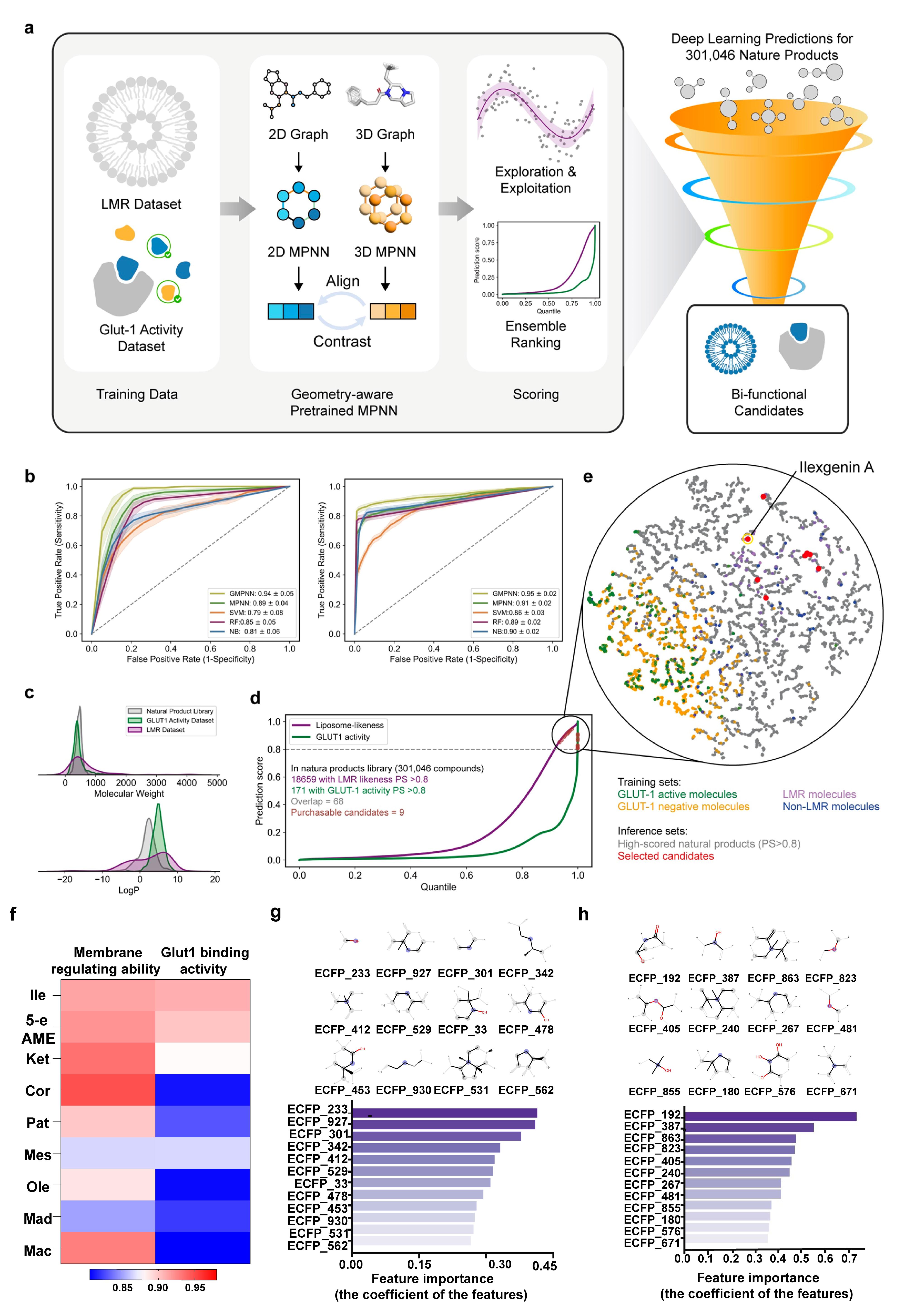 如图1,研究团队开发了一种几何感知消息传递神经网络(GMPNN),通过对比学习策略,从分子二维结构中推断三维构象信息,克服了传统深度学习模型对大数据集的依赖及几何特征建模的不足。该模型经收集的LMR及肿瘤靶标葡萄糖转运体(Glut1)配体数据集训练后,在LMR预测和Glut1结合活性预测任务中表现优异,显著优于支持向量机(SVM)、随机森林(RF)等传统方法。基于该模型,团队对天然产物库(DNP)中30余万种分子进行虚拟筛选,结合结构多样性与相似性分析,最终选出9种候选分子。
