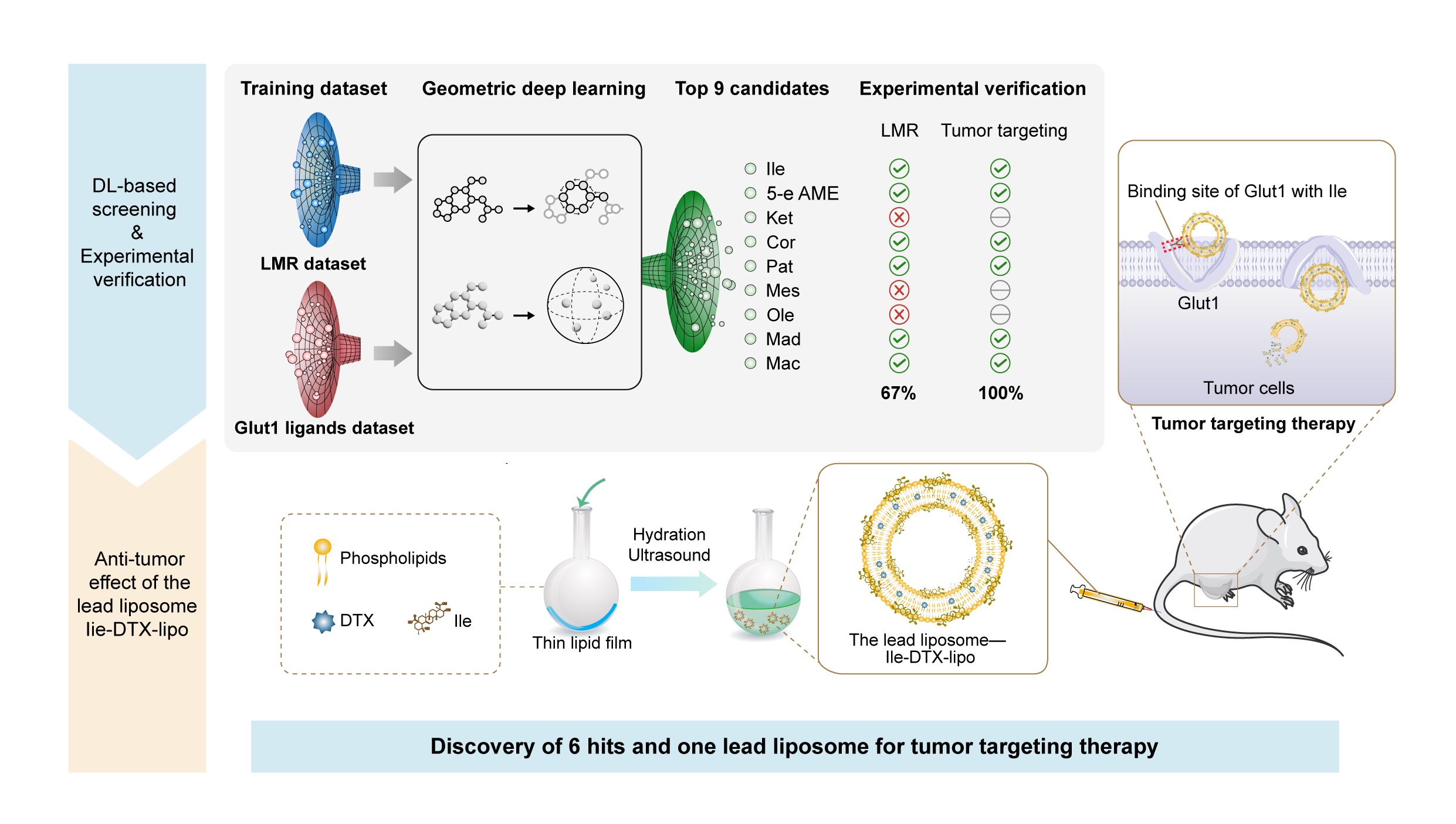 传统脂质体肿瘤靶向能力有限,从而影响其临床疗效。虽然配体修饰的脂质体在提升肿瘤靶向效率方面展现出潜力,但工艺复杂,临床转化难。项目组前期研究发现某些天然产物兼具脂质体膜调控与肿瘤靶向功能,有望无需配体合成,简单替换脂质体中的胆固醇为该类天然产物即实现肿瘤靶向。但天然产物多达30多万种,传统试错法筛选该类双功能天然产物耗时费力。因此,本研究提出将人工智能深度学习算法模型与湿实验相结合,快速发现新型双功能天然产物。通过数据集收集、几何感知深度学习模型构建、性能预测及湿实验验证,从超30万种天然产物中高效筛选出6个双功能天然产物。其中,基于冬青苷元A(Ile)构建的脂质体在肿瘤靶向能力和抗肿瘤效果最优,证实了深度学习技术在设计智能靶向药物递送系统中的巨大潜力。