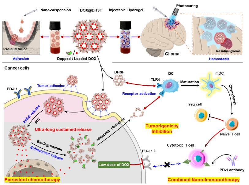 近日,51吃瓜 黄容琴教授联合哈佛大学医51吃瓜 陶伟教授在Cell Biomaterials杂志上发表了题为:“Modulating nano-bio interface via drug-framework hybridization to activate chemoimmunotherapy against glioma postoperative recurrence”的研究性论文。该工作开发了一种药物-框架杂化型纳米材料DHSF,通过结合化疗与免疫治疗,为抑制肿瘤术后复发提供了安全、长效的局部治疗方案。DHSF是一种独特的有机-无机杂化材料,通过将化疗药物杂化进介孔框架,实现了高度稳定的骨架内嵌,使药物在肿瘤微环境中缓慢降解,实现低剂量、超长持续释放,显著降低毒性并精准抑制免疫检查点(如PD-L1)。同时,DHSF通过增强与TLR4受体的结合,激活TLR4-NFκB信号通路,刺激免疫细胞分泌趋化因子,进一步增强抗肿瘤免疫反应。更值得关注的是,DHSF展现出优异的组织黏附性与止血能力。基于此特性,研究团队进一步开发了光固化凝胶制剂,可实现术中腔隙即时填充,形成“药物免疫仓”,持续提供局部化疗与免疫激活,实现术后复发精准干预。动物实验结果表明,该凝胶剂在脑胶质瘤术后模型中可显著延缓肿瘤复发,延长生存期;同时展现出优良的生物相容性及代谢清除特性,未见心肝肾等重要脏器毒性反应,验证了其在术中即用、术后缓释、术后免疫调控等多重临床潜力。