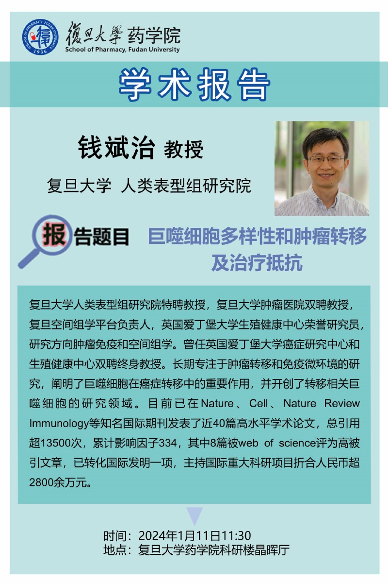 钱斌治教授1月11日学术报告-巨噬细胞多样性和肿瘤转移及治疗抵抗