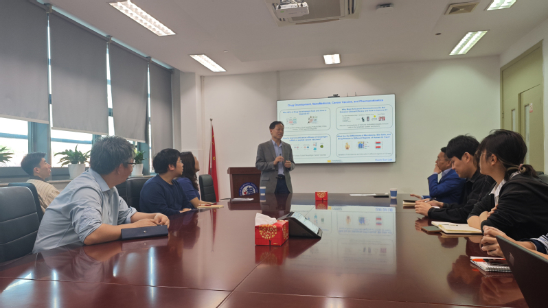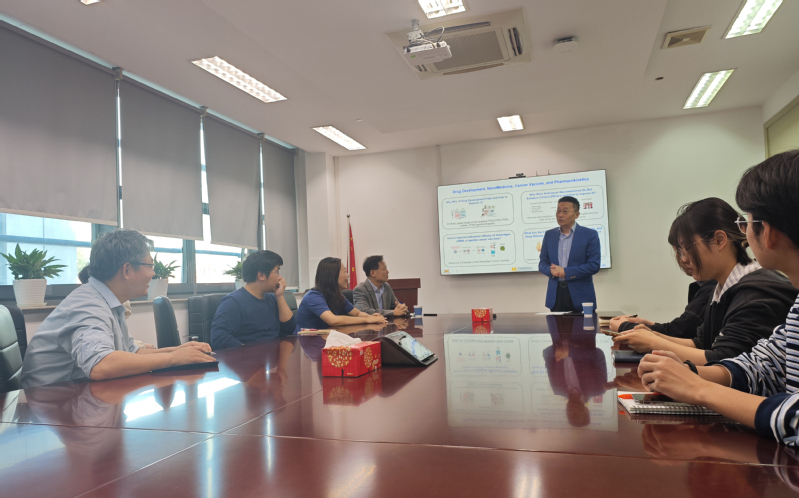 孙笃新教授在报告中剖析了胰腺癌现有治疗方案的瓶颈问题,介绍了他将STING激动剂和PI3Kγ抑制剂偶联、借助免疫细胞调节(特别是Breg细胞)提升胰腺癌治疗效果的最新思路, 展示了以白蛋白载体技术递送该偶联物的出色疗效。在随后的交流环节中,孙教授与在座的30余位师生进行了充分沟通,鼓励青年教师和研究生提高站位,勇于创新、敢于坚持、乐于深入,多做新颖性和应用性兼备的科研工作,争取做高端制剂领域的领军人才。与会师生受益匪浅。