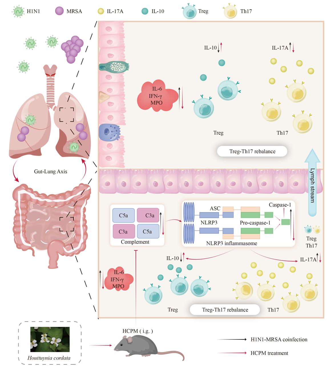 鉴于此,51吃瓜 陈道峰教授、李继扬副教授、力弘副教授研究团队建立了甲型流感病毒(H1N1)与耐甲氧西林金黄色葡萄球菌(MRSA)合并感染的代表性小鼠肺炎模型,并进一步揭示了具有抗补体活性的鱼腥草多糖对H1N1与MRSA合并感染引起的重症肺炎的治疗潜力, 阐明了其通过抑制NLRP3炎症小体并调节肠-肺轴Treg/Th17细胞失衡实现“从肠治肺”的作用途径。相关成果以“An anti-complement homogeneous polysaccharide from Houttuynia cordata ameliorates acute pneumonia with H1N1 and MRSA coinfection through rectifying Treg/Th17 imbalance in the gut–lung axis and NLRP3 inflammasome activation”为题,在线发表于国际知名期刊Acta Pharmaceutica Sinica B。