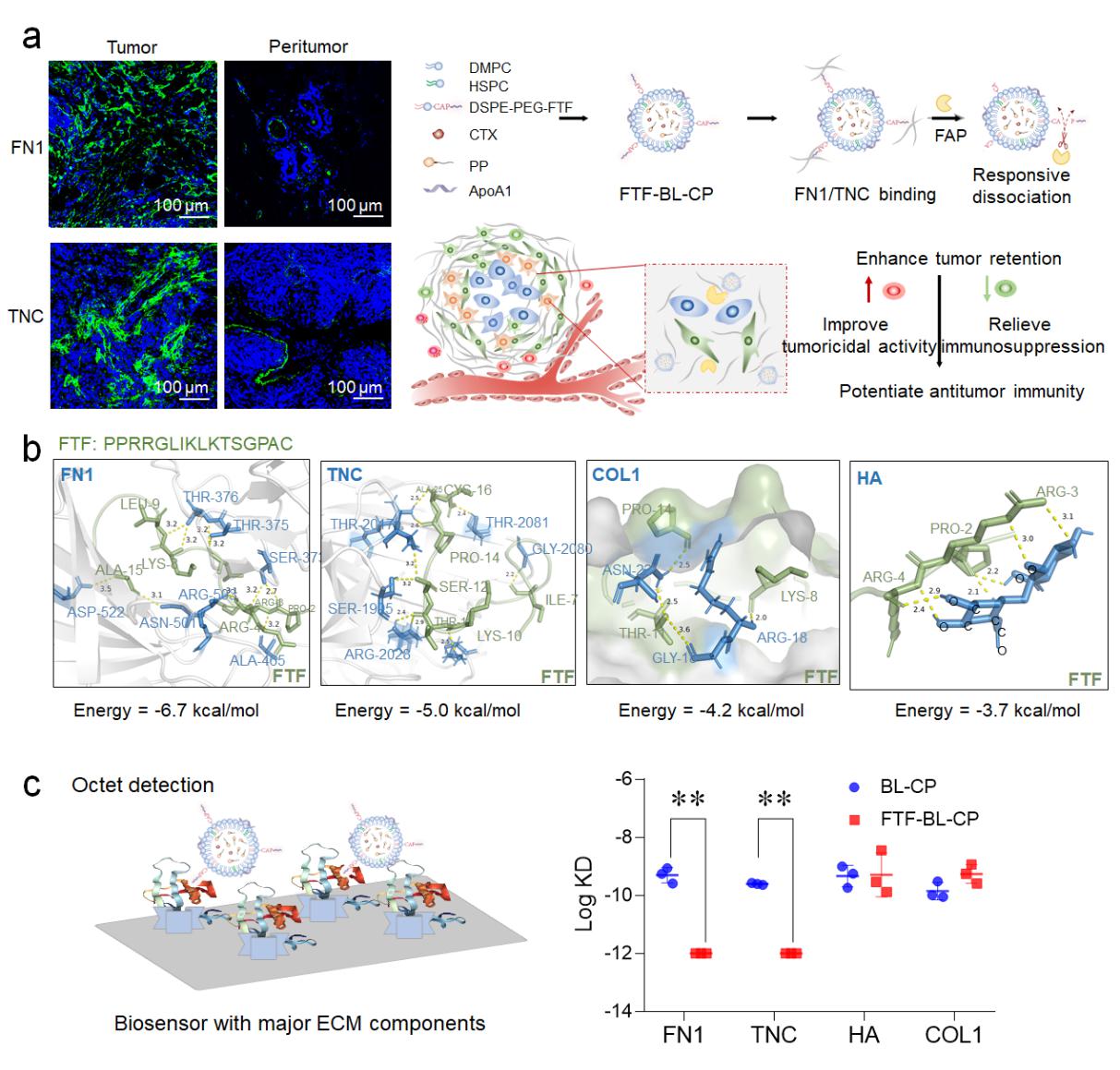 图1肿瘤基质捕获型仿生脂蛋白系统FTF-BL-CP的设计思路及与肿瘤基质中TNC和FN1特异性结合的评价