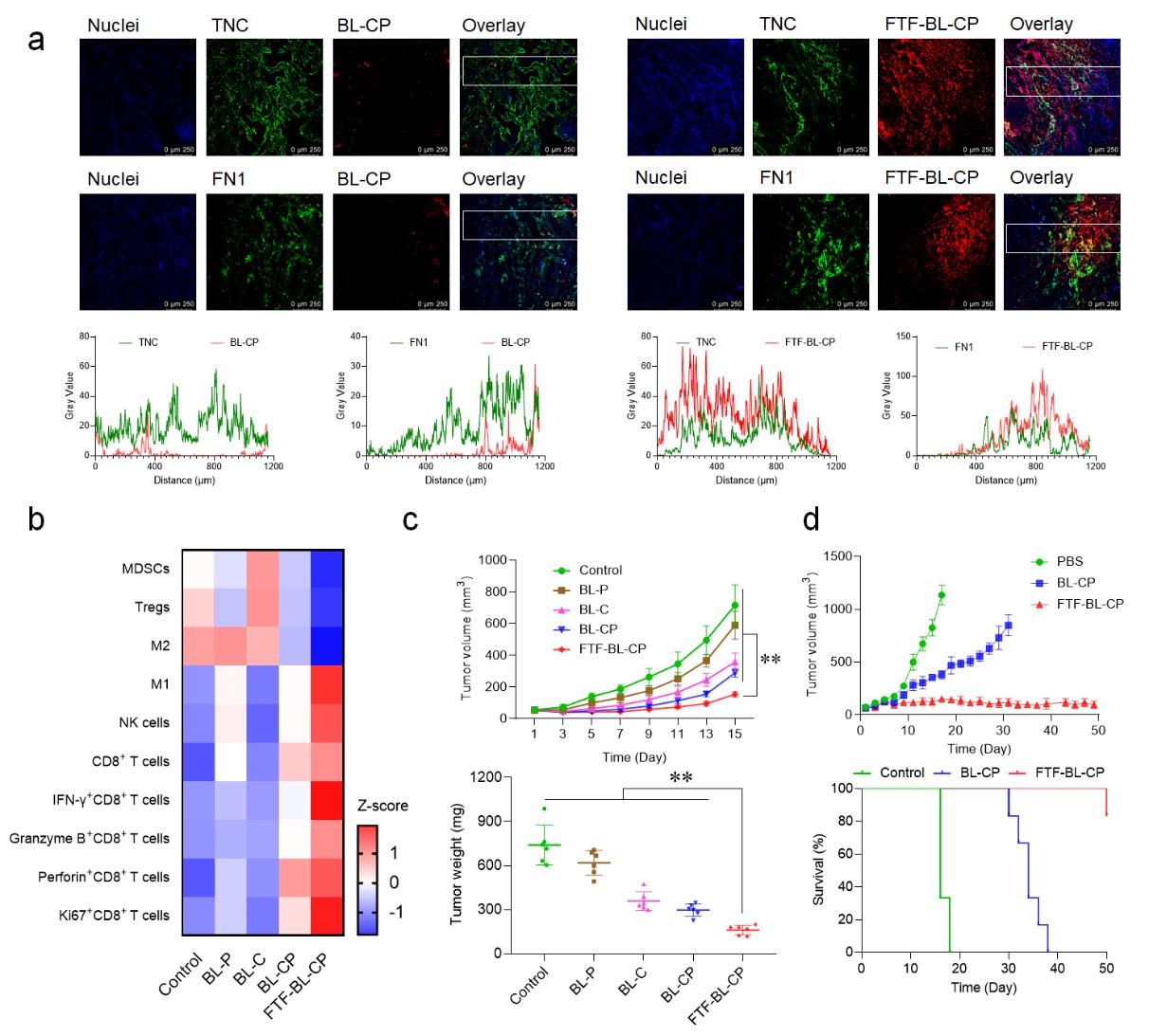 图2 FTF-BL-CP与乳腺癌肿瘤基质中TNC和FN1特异性结合,进而增强抗肿瘤免疫应答、抑制肿瘤生长