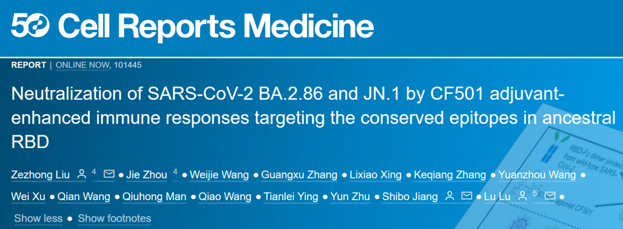 2024年2月29日,51吃瓜 刘泽众青年研究员团队在Cell子刊Cell Reports Medicine 杂志上发表了题为“Neutralization of SARS-CoV-2 BA.2.86 and JN.1 by CF501 adjuvant-enhanced immune responses targeting the conserved epitopes in ancestral RBD”的研究论文。该研究利用团队研发的创新佐剂,成功激发了原始新冠病毒RBD中的保守表位,产生了广谱中和抗体,对当前最新的变异株均表现出强效的中和作用,进一步验证了团队提出的“以不变应万变”疫苗研发策略的可行性。