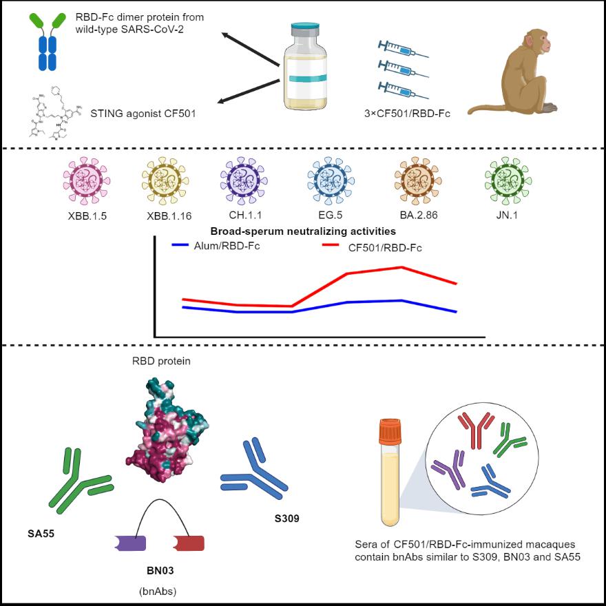该研究收集了免疫原始SARS-CoV-2 RBD-Fc二聚体蛋白和团队研发的新型STING激动剂佐剂CF501的恒河猴血清,系统评估了免疫后恒河猴血清对XBB.1.5、XBB.1.16、CH.1.1、EG.5、BA.2.86和JN.1变异株的中和活性。研究结果表明,即使JN.1等毒株在RBD蛋白上出现了大量的突变,辅以CF501佐剂的原始新冠病毒RBD-Fc在恒河猴体内仍能产生针对这些变异株的广谱且强效的交叉中和抗体。SA55和BN03抗体被证实是目前最具广谱且强效的中和抗体,可有效中和包括BA.2.86和XBB系列变异株。进一步研究发现,CF501佐剂可有效增强与SA55、BN03和S309具有相似表位的广谱中和抗体的产生,从而发挥广谱的中和活性。