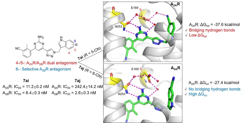 图 1. 新型吲哚类A2AR/A2BR双靶点拮抗剂7ai和A2BR选择性拮抗剂7aj的发现