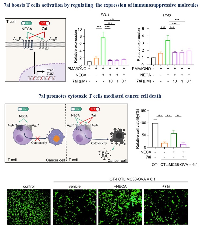 本研究首先对临床试验进展最快的化合物AB928进行初步结构探索,发现了一类含有吲哚结构并具有A2AR/A2BR双靶点拮抗活性的苗头化合物,该类化合物对其他腺苷受体亚型A1R/A3R亲合性较低。随后研究发现,吲哚环的结构微调会对A2AR/A2BR活性和选择性产生显著影响(图1),在吲哚4、5位取代会产生强效的A2AR/A2BR双靶点作用,而在吲哚6位取代则会产生高选择性的A2BR拮抗作用。分子动力学模拟显示,5-氰基吲哚化合物7ai通过水分子与A2AR中的E169或F168形成稳定的桥连氢键作用,其结合自由能较低。6-氰基吲哚化合物7aj的氰基朝向不能通过水分子与周围氨基酸形成稳定氢键,导致A2AR拮抗活性明显降低。进一步的作用机制研究表明,化合物7ai通过下调免疫抑制分子PD-1和TIM-3的表达有效增强了T细胞的激活;经典的MC38-OVA/OT-I细胞毒性T淋巴细胞杀伤试验表明,化合物7ai可以增强T细胞的细胞毒性功能(图2)。这项工作优化出了比临床化合物Etrumadenant具有更高A2BR活性、更均衡A2AR/A2BR双靶点活性且几乎无A1R/A3R活性的双靶点拮抗剂7ai,以及A2BR选择性拮抗剂7aj,为后续获得新型A2AR/A2BR双靶点拮抗剂或A2BR选择性拮抗剂提供了新的先导化合物和优化策略。