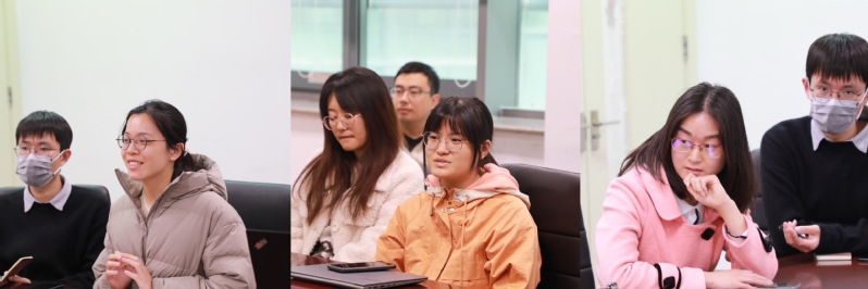 几位老师发表意见以后,师生们围绕职业发展、就业选择及行业前景等展开热烈探讨。蔡毅范同学就出国做博士后的前期准备提出疑问,老师们建议:首先确定目标研究方向,其次关注相关领域的导师,同时注重总结自己的科研经历,讲好科研故事,提供详实、个性化的推荐信。丁源同学提出继续做科研和步入工业界的选择问题,疑惑如何提高择业竞争力。老师们认为主要是兴趣导向,若学有余力可同时准备,优先选择专业匹配度较高的职业,先就业再择业。聂慧芳同学疑惑是先出国进行博士后研究,还是获得教职后进行交流访学,老师们建议博士毕业后直接进行博士后研究,这样更能心无旁骛。