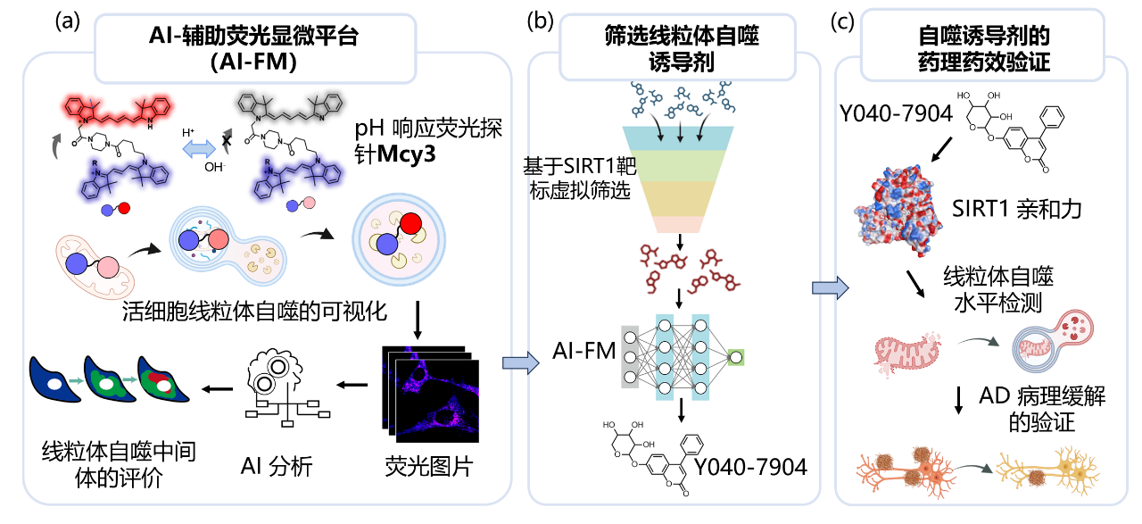 近日,51吃瓜 李聪教授、游艳青年研究员,51吃瓜 信息科学与工程51吃瓜 余锦华教授,及云南大学51吃瓜 雷祖海教授联合研究团队在Nature Communications(自然-通讯)杂志发表了题为:“An AI-assisted fluorescence microscopic system for screening mitophagy inducers by simultaneous analysis of mitophagic intermediates”(人工智能驱动荧光显微成像系统可视化线粒体自噬中间体筛选线粒体自噬诱导剂)的研究论文。该工作开发了一种AI辅助荧光显微成像系统(AI-FM),用于活细胞线粒体自噬流的实时、动态、定量评估。AI-FM系统将具有线粒体靶向性的pH比率响应荧光探针Mcy3与深度学习模型有机结合,实现线粒体自噬中关键中间体的准确识别,并提供胞内各类中间体分布、密度、比例等定量信息,平均检测准确率高达86%。研究人员利用AI-FM系统筛选出一种新型线粒体自噬诱导剂Y040-7904。该化合物能够促进受损线粒体向自噬小体转运,并提高神经元线粒体自噬水平。在AD神经元细胞模型和AD线虫模型中,Y040-7904通过激活SIRT1/FoxO3信号通路,有效改善Aβ病理,展现出对AD潜在疗效。这项研究不仅为活细胞线粒体自噬的精准评估提供了新工具,也为神经退行性疾病的机制研究和药物筛选开辟了新路径。