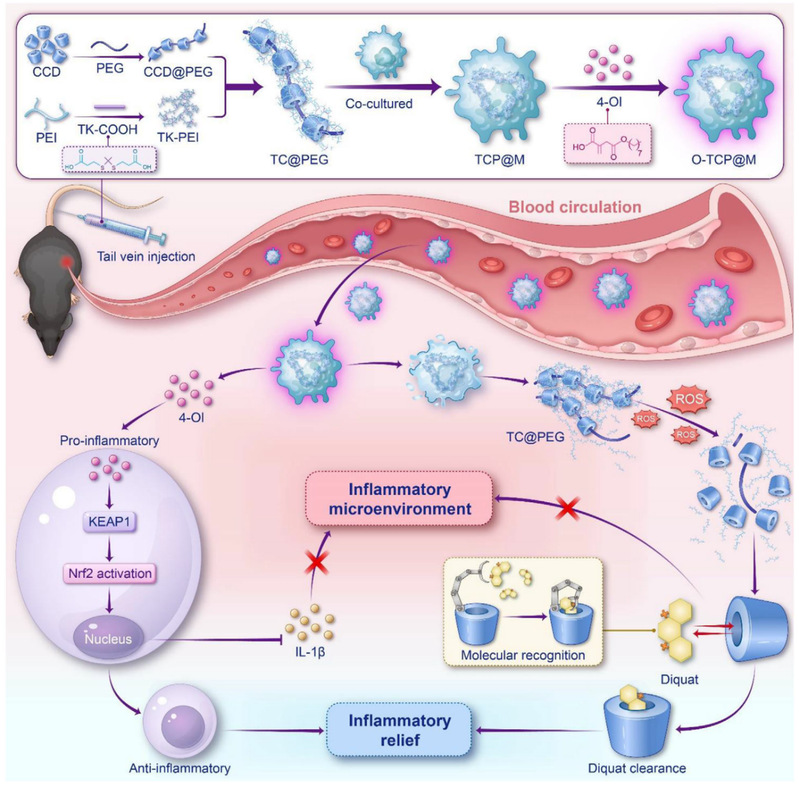 敌草快中毒的致死率居高不下,主要原因在于其独特的双吡啶阳离子结构,使其能够特异性地在肾脏富集,与肾小管上皮细胞结合,诱导活性氧(ROS)过量产生,进而引发氧化应激、炎症反应,最终导致肾脏衰竭。传统的血液透析等治疗手段无法有效清除已蓄积到肾脏组织中的敌草快,因此急需开发一种能够主动靶向毒素蓄积组织并打破病理反馈循环的新型疗法。本项研究设计并合成了一种基于电荷中和原理的解毒剂——多取代羧甲基α-环糊精(CCD),通过分子模拟计算和AI筛选,发现其能够精准识别并捕获敌草快分子,同时抑制 ROS生成。为了增强肾脏靶向性,将负电性CCD穿引至聚乙二醇链上形成“分子项链”的假聚轮烷结构,利用ROS响应断裂的阳离子聚合物进行包覆稳定,并将该复合物封装于巨噬细胞内,借助其固有的炎症趋化作用,实现肾脏的主动靶向递送。此外,该仿生递释系统中还引入了 4-辛基顺乌头酸盐(4-OI),通过激活机体Nrf2抗氧化通路,协同打破ROS-炎症恶性循环。