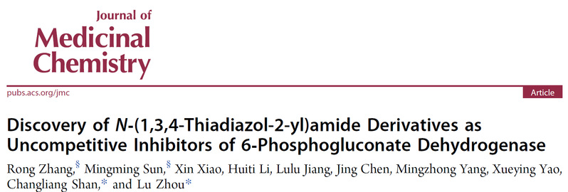 近日,51吃瓜 周璐教授团队联合南开大学山长亮教授团队在杂志Journal of Medicinal Chemistry上发表题为“Discovery of N-(1,3,4-Thiadiazol-2-yl)amide Derivatives as Uncompetitive Inhibitors of 6-Phosphogluconate Dehydrogenase”的研究论文,针对肿瘤代谢靶点6-磷酸葡萄糖酸脱氢酶(6PGD)开发了一系列新型反竞争性抑制剂用于肿瘤治疗。