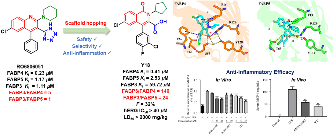 RO6806051是由罗氏公司开发的FABP4/5双靶点抑制剂,但同时显示出强的FABP3抑制作用。研究团队以RO6806051为先导,基于前期对抑制剂与FABP3及FABP4/5的作用方式的差异分析,通过骨架跃迁策略发现了一类含有异喹啉酮骨架的新型FABP4/5双靶点抑制剂,并实现了对FABP3的高选择性。通过构效关系研究、体内外抗炎活性评价和类药性评价等确定化合物Y18为候选化合物,其对FABP4和FABP5显示出强效抑制活性,Ki值分别为0.41 μM和2.53 μM,对FABP3的Ki值为59.72 μM,选择性显著优于RO6806051(FABP3 Ki/FABP4 Ki=5, FABP3 Ki/FABP5 Ki=1)。Y18具有良好的药代动力学特性,口服生物利用度为32%,口服Y18能减轻LPS诱导的肝损伤。此外,该化合物表现出优秀的安全性—hERG抑制作用弱(IC50>40 μM)、细胞毒性低(IC50>40 μM)及半数致死剂量高(>2000mg/kg)。综上,Y18是一个活性强、选择性高、类药性好的FABP4/5双靶点抑制剂,具有治疗炎症相关疾病的潜力。