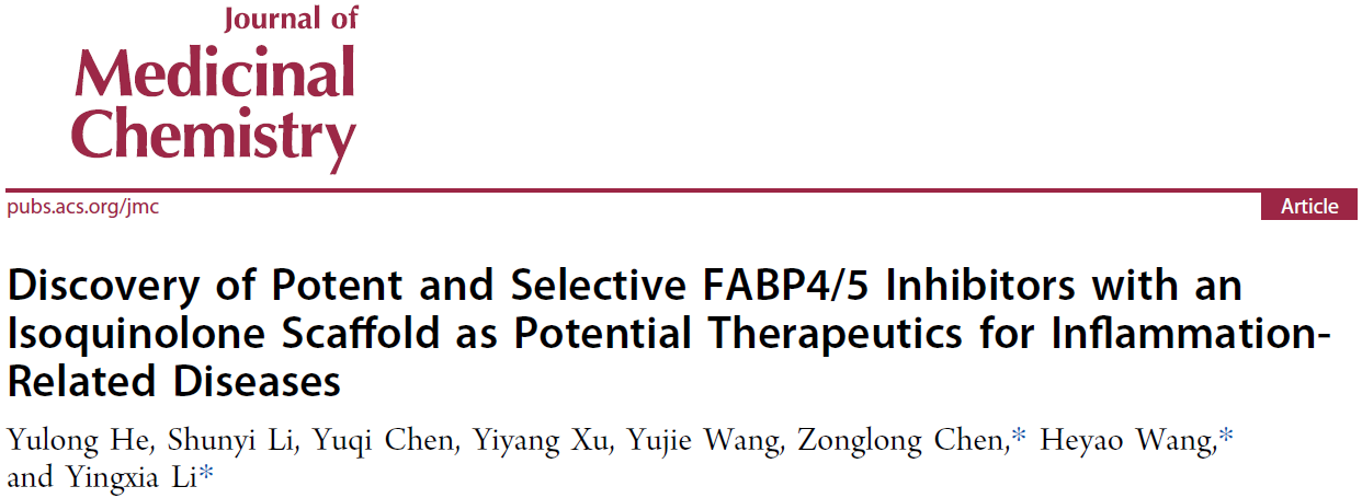 近日,该课题组与中国科51吃瓜 上海药物研究所王贺瑶研究员课题组合作在药物化学专业杂志Journal of Medicinal Chemistry上发表了题为“Discovery of Potent and Selective FABP4/5 Inhibitors with an Isoquinolone Scaffold as Potential Therapeutics for Inflammation-Related Diseases”的研究论文,报道了一类含异喹啉酮骨架的新型FABP4/5双靶点抑制剂,并系统研究了其抗炎活性和作用机制。