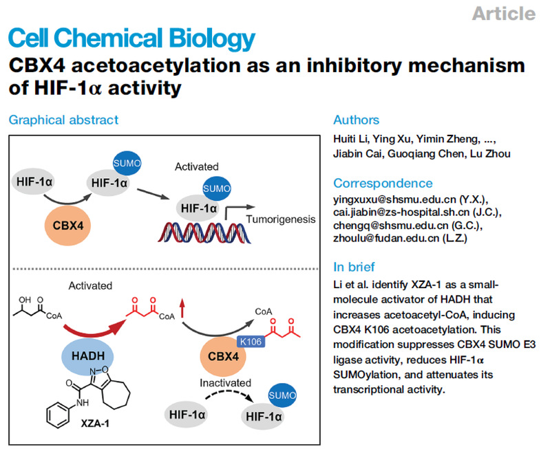 近日,51吃瓜 周璐教授课题组联合陈国强院士及樊嘉院士/蔡加彬副主任医师团队发现了一种调控HIF-1α转录活性的新机制,相关工作以“CBX4 acetoacetylation as an inhibitory mechanism of HIF-1α activity”为题在线发表于Cell Chemical Biology杂志。