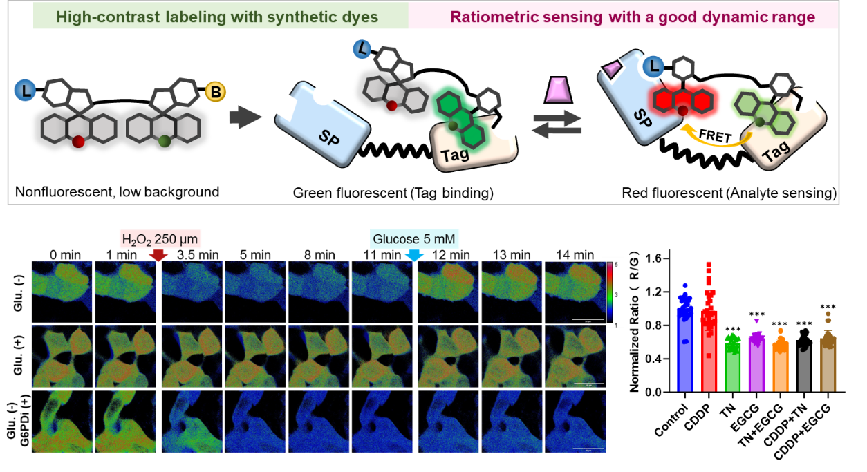 本项目基于蛋白响应型染料构建化学遗传编码探针FOCS (Fluorogenic rhOdamine-based Chemigenetic biosensor),其包括小分子化学探针和标签/识别蛋白组成。小分子探针由绿色供体染料和红色受体染料构成,其与标签蛋白结合之后,发射绿色荧光;而NADPH会促进小分子探针与识别蛋白结合,进而发射红色荧光,而通过红/绿色比值则可实现NADPH比率型检测。此探针可快速、特异性、可逆地检测NADPH,不受其他代谢分子(如NADH, ATP等)和pH变化的干扰。在肿瘤活细胞成像中,此探针可动态监测氧化应激条件下NADPH浓度波动,揭示肿瘤细胞中磷酸戊糖途径对NADPH稳态调控作用。同时,此类探针可用于顺铂、硫代烟酰胺、表没食子儿茶素没食子酸酯等药物下NADPH的浓度监测,为抗肿瘤药物联用筛选和机制研究提供可视化工具。