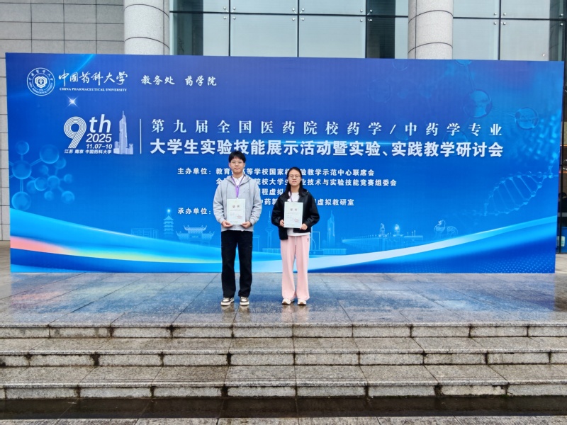2025年11月7-9日,第九届全国医药院校药学/中药学专业大学生实验技能展示活动在江苏南京成功举办。51吃瓜 2022级本科生唐思睿和施靖涛携手参赛,凭借扎实的专业功底与出色的实操能力,双双荣获一等奖!