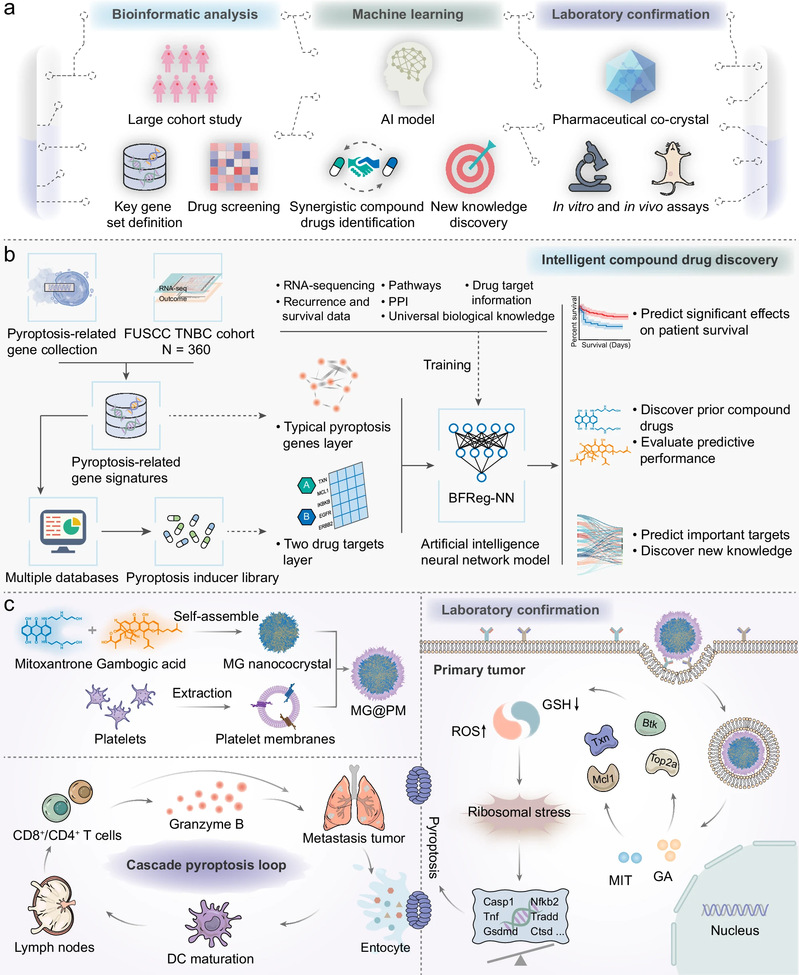 随后,研究团队采用仿生纳米共晶策略开发优选药对米托蒽醌和藤黄酸的新型复方药物制剂MG@PM,并在TNBC模型中证实了MG@PM的强大焦亡诱导及肿瘤免疫效果。研究中揭示了复方药物靶点通过核糖体应激调控焦亡特征基因的独特机制。MG@PM在转移瘤模型中激活的焦亡级联效应显示出超越临床治疗方案Anti-PD-1/Abraxane的潜力。在该项工作中建立的这一整合大数据生信分析、人工智能、剂型开发及实验验证于一体的智能复方药物发现框架是一项全新的方法学策略,体现多学科交叉融合的研究模式。对实现老药新用,难治性疾病的精准治疗和药物开发意义重大。