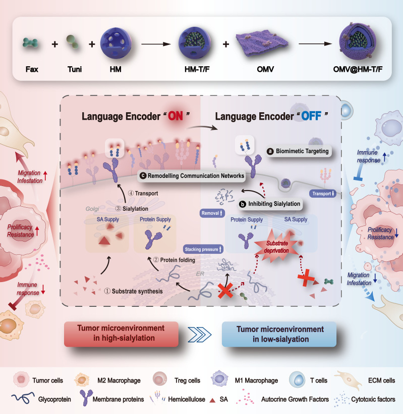 基于此,51吃瓜 蒋晨教授、孙涛副教授团队提出了一种从代谢编码层级切入的精准阻断策略,通过同时抑制糖基化前体生成与唾液酸活化两大关键过程,实现对肿瘤细胞表面终末唾液酸化修饰的系统性干预。研究团队进一步开发了具有跨越血脑屏障能力的“功能菌衍生纳米干扰器”,并通过微环境响应设计实现调控分子的定向递送与原位释放。依托GBM对唾液酸相关聚糖结构的代谢依赖性,该纳米平台能够有效破坏肿瘤细胞的唾液酸“语言编码”机制,削弱其信号整合能力,并重塑肿瘤细胞间通信结构,从而逆转代谢驱动的治疗抵抗性,增强干预响应。