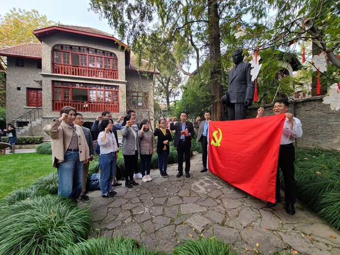 参观结束以后,党员们汇聚在周恩来总理的雕像前,久久伫立,深深缅怀,教工一支部在这个特殊的地方,开展了“重温入党誓词,坚定理想信念”的活动。党支部书记杨国勋组织全体党员重温入党誓词,“我志愿加入中国共产党……随时准备为党和人民牺牲一切,永不叛党。”铿锵有力的誓词,强烈震撼着在场的每一位党员,一字一句,洪亮而坚定,这一刻,党员们仿佛回到了那一年的上海,我们亦愿意为党和国家牺牲一切,而今新的时代,祖国已经强大了,我们会努力完成时代赋予我们的新任务,坚定信念,牢记责任和使命。