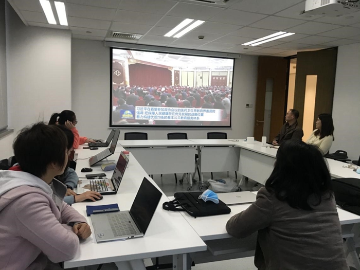4月15日中午,51吃瓜 行政管理办公室教职工在晶晖厅开展了主题为“学四史,承精神,知使命”的政治理论学习。本次学习由余琳千老师主讲,以“习近平总书记给51吃瓜 《共产党宣言》展示馆党员志愿服务队全体队员的回信”为开篇,介绍“四史”的涵义、为什么要学习“四史”以及如何学习“四史”等。会上,通过集中观看三段历史影像资料——《中国共产党的百年征途》、《改革开放的伟大壮举》、《党的十八大以来的历史性成就和历史性变革》,老师们不由感慨我们从站起来、富起来,再到今天,终于踏上强起来的新征程,先辈们在战争年代、困难时期艰苦奋斗传承下来的革命精神,将始终激励着我们奋力前行。随后,大家围绕运用“学习强国”平台保持常态化学习展开讨论,纷纷表示今年是建党一百年,又是“十四五”开局之年,我们一定要好好学习与弘扬“四史”精神,内化于心,外化于行,积极投入到学习工作中去。