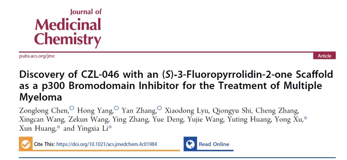 近日,该课题组与临港实验室黄洵研究员课题组、中国科51吃瓜 广州生物医药与健康研究院许永研究员课题组合作在药物化学专业杂志Journal of Medicinal Chemistry上发表了题为“Discovery of CZL-046 with an (S)-3-Fluoropyrrolidin-2-one Scaffold as a p300 Bromodomain Inhibitor for the Treatment of Multiple Myeloma”的研究论文,报道了一种新型p300溴结构域抑制剂CZL-046并研究了抗多发性骨髓瘤的活性和作用机制。