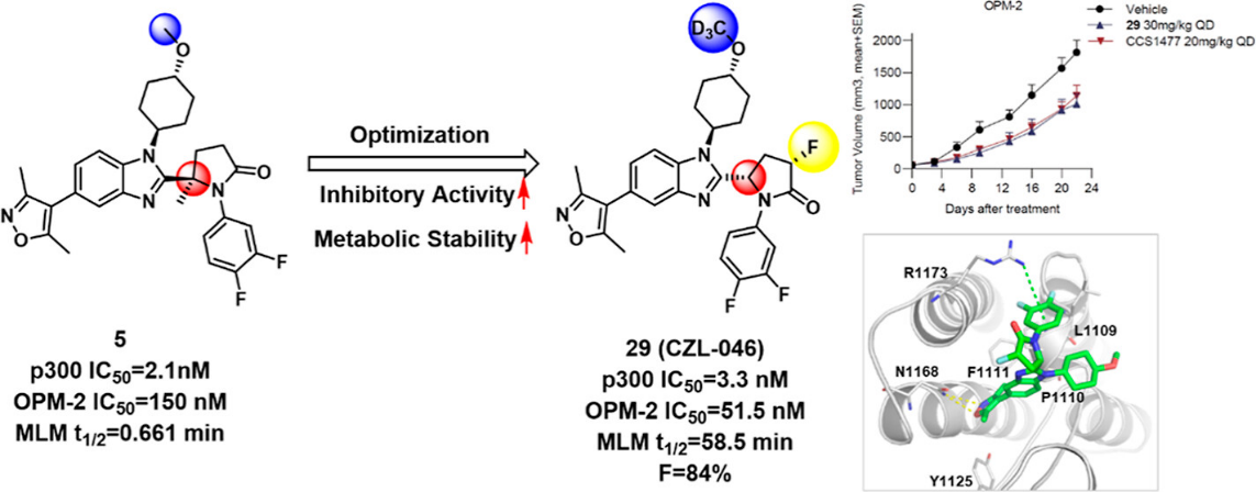 该研究团队前期通过骨架跃迁策略发现了一种含有吡咯烷-2-酮骨架的新型p300溴结构域抑制剂,在此基础上,本研究进一步开展成药性优化,通过肝细胞代谢产物分析实验确定了化合物5的代谢位点,经过系统的结构优化获得了候选化合物CZL-046,分子在保留活性的同时显著提高了代谢稳定性(MLM t1/2=58.5 min)和口服生物利用度(F=84%)。该化合物能够抑制多发性骨髓瘤细胞OPM-2的c-Myc和IRF4的转录及c-Myc和H3K27Ac的表达,并在小鼠体内模型中显示出较强的肿瘤抑制效果,具有成为治疗多发性骨髓瘤的药物的潜力。此外,研究团队还通过衍射实验得到了化合物的单晶结构以及和CBP溴结构域的共晶结构,为该类抑制剂的分子设计和结构优化提供了重要参考。
