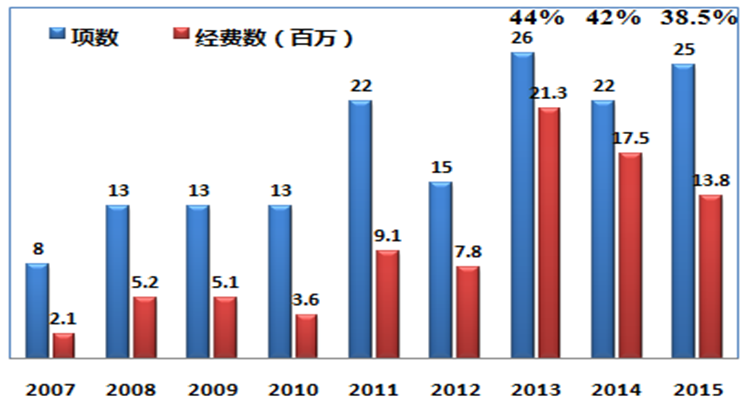 图1. 各年度自然基金项目数量和经费总量及近3年中标率