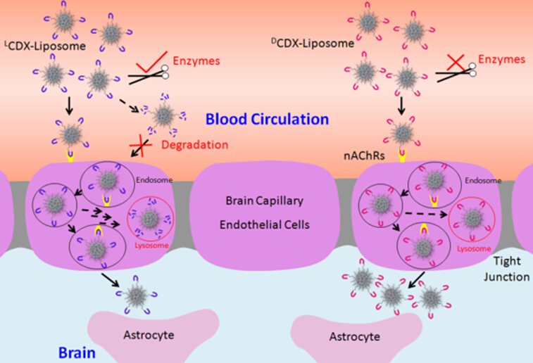 近日,由陆伟跃教授领衔的国家重大科学研究计划项目在脑部药物递送方面取得重要进展。陆伟跃教授的课题组通过计算机辅助设计合成了一种稳定的脑靶向多肽分子DCDX,与烟碱型乙酰胆碱受体具有高亲和力,可携带递药系统穿透血脑屏障入脑。该研究首次采用烟碱型乙酰胆碱受体的D构型配体分子携带脂质体递药系统入脑,有效治疗脑部疾病,证明了 D型多肽分子在介导脑靶向递药方面的优势,为设计更有效的脑靶向递药系统提供了新思路。