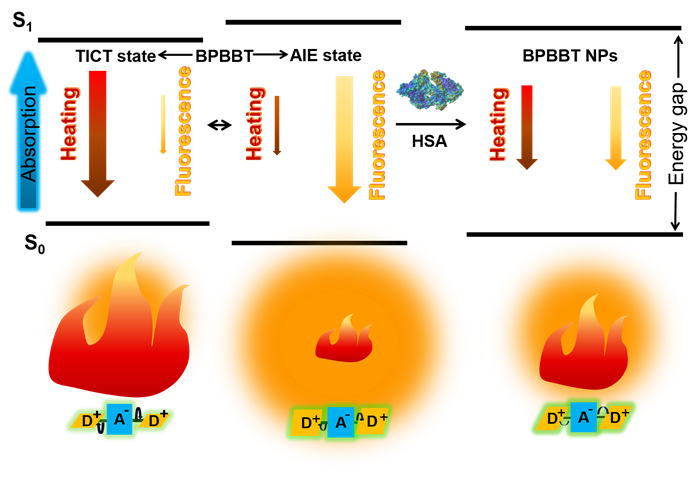 术中荧光成像具有分辨率高和成像快速的优点,可引导外科医生术中更清楚地区分微小肿瘤与正常组织。然而,目前临床使用的术中荧光探针的激发和发射波长在可见光范围,成像深度有限,组织自发荧光干扰强。如果能够找到一种成像深度更深、背景干扰低的近红外荧光探针分子,它同时还具有吸收光能转化为热能并产生热消融的光热转化性能,就可以实现对术中检测到的微小肿瘤实施光热治疗,从而杀死肿瘤细胞。因此,发展兼具光热转化性质的诊疗一体化近红外荧光探针制剂,是术中诊疗微小肿瘤技术能够临床转化所亟需解决的关键问题。