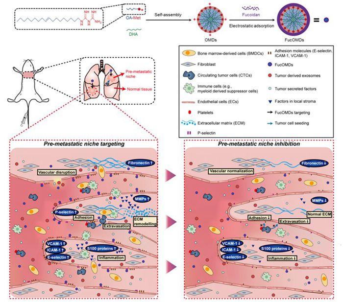 肿瘤转移前微环境是一种特殊的炎症微环境,可使循环肿瘤细胞(CTCs)定植,可作为预防转移的潜在靶点。然而,很少有研究致力于开发对症药物及递释系统来调节转移前微环境。51吃瓜 陈钧教授和上海交大高小玲研究员团队合作报告了利用杂合靶向胶束以调节转移前微环境并抑制肿瘤转移的研究。该胶束采用两种低毒性抗炎化合物即脂肪链改造的二甲双胍和二十二碳六烯酸(DHA)自组装而成,其表面包覆岩藻多糖用于靶向转移前微环境。该功能化胶束(FucOMDs)具有良好的靶向效率和血液长循环特性,可以抑制CTC对激活内皮细胞的粘附,减轻肺血管通透性并逆转转移前微环境中关键蛋白的异常表达。体内外研究表明,FucOMDs可有效预防肿瘤转移的形成,并可与靶向化疗联合并有效抑制原发肿瘤的生长和转移。该研究为肿瘤转移前微环境的靶向治疗及抑制肿瘤转移提供了新思路,并具有临床转化前景。