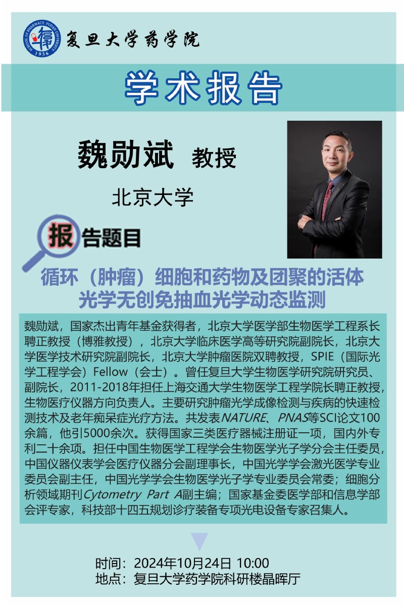 10月24日学术报告 - 循环(肿瘤)细胞和药物及团聚的活体光学无创免抽血光学动态监测