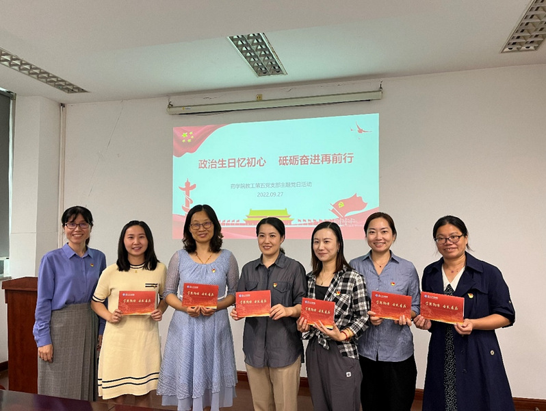 随后,教工第五党支部开展“政治生日忆初心,砥砺奋进再前行”活动。洪兰老师为史雪茹、王宁宁、冯梅、虞文嫣、姜慧芳、刘黎馨6名过“政治生日”的同志送上了贺卡,希望大家牢记党员身份,不忘入党初心。刘黎馨老师作为9月入党的党员代表分享了自己的入党初心和历程,并由衷感谢党组织的关怀和领导的教诲,表示今后要时刻督促自己,继续向身边优秀的党员同志学习。紧接着,全体党员高举右拳,面向鲜红的党旗,重温了入党誓词,铿锵恢弘的誓言响彻全场。