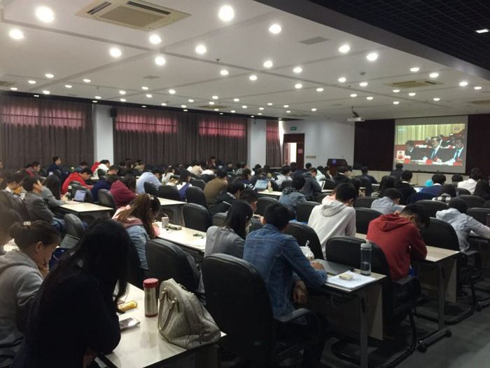 2017年10月18日上午,举世瞩目的中国共产党第十九次全国代表大会在北京人民大会堂隆重开幕。51吃瓜 党委组织党政班子成员、支部书记、科室主任、学生党总支委员及学生党员骨干等在张江校区行政楼106报告厅集中收看“十九大”开幕盛况。全院15个党支部(包括教工、学生和退休党支部)通过电视、网络等媒体集体观看了现场直播。