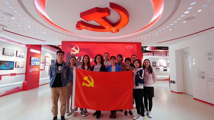 座谈会后,两支部的部分党员前往张江国创中心华凯创意公司参观学习“习近平新时代中国特色社会主义思想展”。大家首先观看了一段影片,回顾了100年前中国共产党筚路蓝缕、艰难创业的历程,涤荡了心灵,感悟革命前辈崇高的共产主义信念和理想。用习近平总书记的“金句”制作的党徽展板引起了大家的兴趣,看着这些简短、精炼、温暖、朴实、深入人心的话语,参观师生仿佛进行了一次心灵对话,经历了一次思想教育。在观展过程中,一幅中国地图吸引了大家的注意,上面密密麻麻地记录了习近平总书记就任以来在全国考察的足迹。习近平总书记用脚步丈量祖国大地,深入企业、田间、百姓家中,亲身感知人民生活变化,践行为人民服务的初心和使命。大家表示深受鼓舞和感动,要向习近平总书记学习,到群众中去,为群众排忧解难,不忘初心,牢记使命,勇挑重担。最后的展览内容聚焦习近平总书记对张江高科技园区的关注。习近平总书记多次来到张江地区并作出指示,体现了他对张江这片科研热土的关切与期待。在场的每位学生和老师纷纷表示一定要做好自己的本职工作与科研任务,努力为我国基础科研创新和科技强国建设贡献自己的力量,不辜负习近平总书记的殷切希望和重托。最后两支部党员在党徽下集体合影。