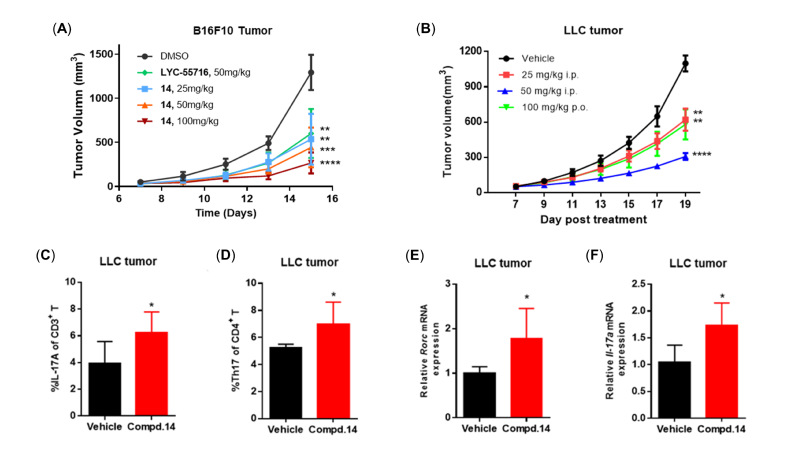 图2. 候选化合物14在小鼠B16F10(A)和LLC(B)肿瘤模型中的体内药效,以及化合物14治疗后LLC瘤内CD3+ T细胞(C)和CD4+ T细胞(D)中IL-17A+细胞比例及Rorc(E)和Il-17a(F)基因表达水平的变化