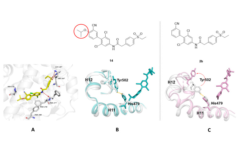 分子对接研究发现,化合物14的砜基与RORγt配体结合域(LBD)中的Leu287和Arg367形成关键的氢键作用,酰胺linker中的NH与Phe377的羰基形成氢键,结构中的三个苯环分别与Phe377、Phe378和Phe388形成π-π堆积作用(图3A)。为理解激动剂化合物14的异丙氧基如何通过稳定RORγt 活性功能域2(AF2)而将功能翻转为激动作用,该团队与51吃瓜 李嫣副研究员团队合作完成动力学模拟研究。研究结果显示,苯环对位无取代的反向激动剂2b因与蛋白之间存在较大的空腔,Tyr502容易发生构象翻转而迫使His479-Tyr502氢键断裂(图3C),而激动剂化合物14的异丙氧基可以稳定蛋白结构中His479和 Tyr502之间的氢键(图3B),这一氢键对于稳定AF2螺旋12(H12)的激动构象和维持RORγt受体激动功能至关重要。