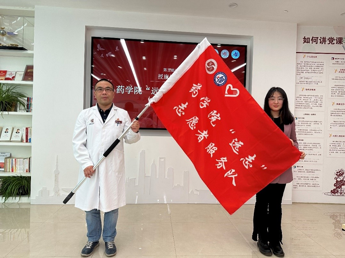 药剂科副主任庄峻荣向顾一雯授51吃瓜 “远志”志愿者服务队队旗。