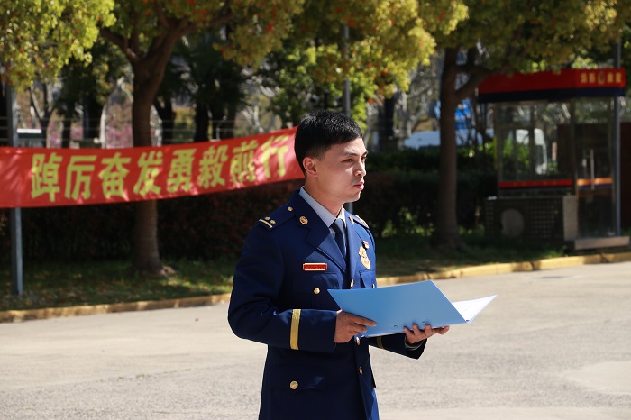 上海市浦东新区张江消防救援站政治指导员沈骏强做赛前动员