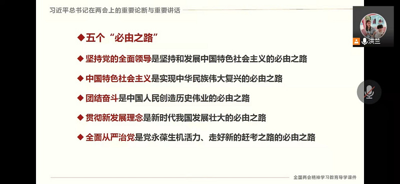 首先,支部书记洪兰老师带领大家学习《全国两会精神学习教育导学课件》和习近平总书记在2022年中央党校中青年干部培训班的重要讲话,细致解读了习近平总书记在两会上作出的“五个必由之路”和“五个有利条件”的重要论断,以及政府工作报告中关于教育的工作任务。通过学习,党员们深深地为党和国家各项事业取得的重大成就感到骄傲,尤其是在全球疫情形势严峻的当下,我国能率先实现经济正增长,统筹推进疫情防控与经济社会发展,离不开党中央的坚强领导,更离不开全国各族人民勠力同心、砥砺奋进的实干精神。我们要切实把思想和行动统一到总书记重要讲话和两会精神上来,将学习贯彻全国“两会”精神同做好疫情防控工作、推动事业高质量发展结合起来,坚持稳字当头、稳中求进,以更加昂扬的奋斗姿态迎接党的二十大胜利召开。