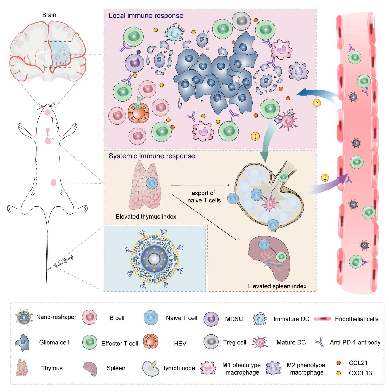 胶质母细胞瘤(GBM)是成人最常见和最致命的原发性恶性脑肿瘤。由于GBM的高度侵袭性和异质性,患者在标准化治疗手段下受益有限。免疫疗法是近年来新兴的肿瘤治疗手段,目前多数疗法通过诱导或激活效应T细胞来发挥抗肿瘤作用。然而GBM对免疫治疗响应率较低,主要原因为其引发严重的系统性和局部性免疫抑制,导致瘤内效应T细胞浸润不足。针对上述瓶颈问题,51吃瓜 陈钧教授团队开发了一种名为纳米重塑者(Nano-reshaper)的纳米制剂,其可重塑系统性和局部性免疫功能,增加肿瘤床内效应T细胞的浸润程度,从而提高GBM对免疫检查点抑制剂的响应。该研究成果发表于国际权威综合性期刊《Nature Communications》。
