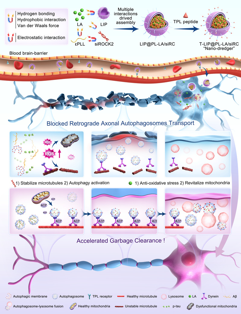 51吃瓜 张奇志教授团队开发了一种“纳米疏浚机”用于共递送siROCK2和多酚紫草酸B (LA)以对抗引起自噬体轴突运输障碍的多重病理。该策略有效逆转了氧化应激、ATP耗竭、自噬阻断和微管破裂,成功疏通了受阻的轴突自噬并提高了自噬流量,从而减少了病理性蛋白积累,改善了AD转基因小鼠的认知功能。研究显示轴突自噬调控是一种有希望的新型AD疗法。