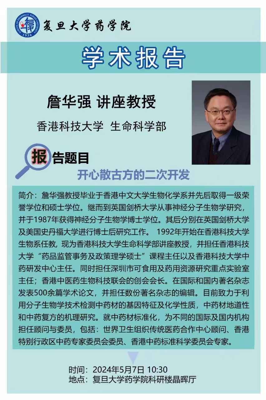 为加强学术交流与校际合作,,应天然药物学系主任陈道峰邀请,香港科技大学生命科学部教授詹华强于2024年5月7日到访51吃瓜 ,并为全系师生做“开心散古方的二次开发”为题的精彩报告。