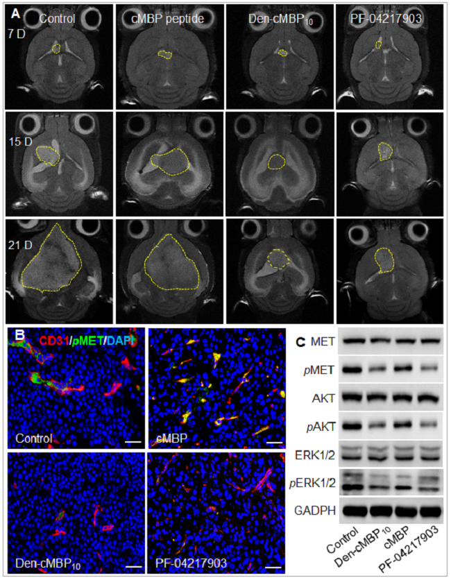 图4. (A) U87MG原位移植瘤小鼠经治疗后的T2加权磁共振成像。(B) Den-cMBP10有效降低U87MG原位移植瘤中pMET的表达量。(C) Den-cMBP10治疗降低移植瘤中MET及其下游信号蛋白的磷酸化。