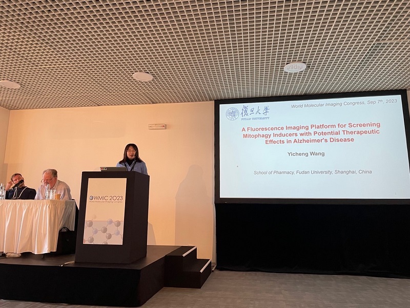 同日,王艺澄同学在世界分子影像大会 “Bright Ideas for Bright Futures: Chemistry for Optical Molecular Imaging”(光学分子成像化学)分会场进行了题目为 A Fluorescence Imaging Platform for Screening Mitophagy Inducers with Potential Therapeutic Effects in Alzheimer's Disease(一类荧光成像平台应用于筛选具有潜在AD治疗效果的线粒体自噬诱导剂)的报告。该报告介绍了一种可用于检测线粒体自噬过程的荧光探针,并且将该探针与深度学习技术相结合,从而构建出筛选线粒体自噬诱导剂的荧光显微成像平台。利用该平台,实现了两种新型线粒体自噬诱导剂的筛选。最后,在细胞层面上验证了这两种新型线粒体自噬诱导剂对AD模型的治疗作用,确定了一种对于AD具有潜在治疗作用的化合物。该荧光成像平台克服了现有评价手段无法准确定量线粒体自噬水平并动态监测线粒体自噬过程的挑战,为筛选潜在的AD治疗药物提供了新工具。该成果获得会议主持人高度评价。