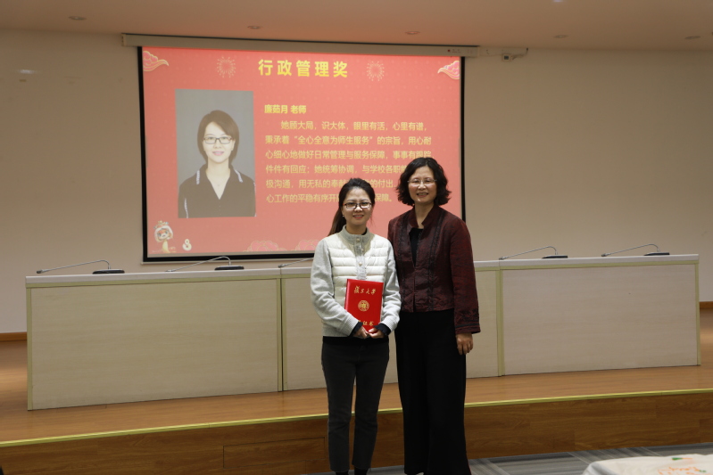 陆伟跃教授为冯美卿、陈瑛两位老师颁发从教三十年荣誉证书。两位老师恪尽职守,无私奉献,用心用情耕耘,培育出了一代代优秀的复旦学子。