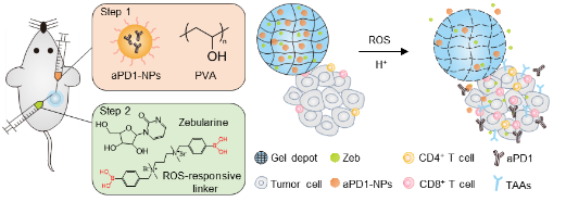 Recently, Prof. Weiyue Lu from Fudan University and Prof. Zhen Gu from UCLA worked together to engineer an in situ formed dual-bioresponsive depot to co-deliver these two agents. PD-1 antibody was first loaded in the pH-sensitive CaCO3 nanoparticles (aPD1-NPs) for locally sustained release, and then the aPD1-NPs and Zeb were encapsulated together into the ROS-responsive hydrogel (Zeb-aPD1-NPs-Gel). This dual-responsive scaffold enabled to achieve controlled release of payloads by responding to the acidic pH and ROS condition associated with TME, and then effectively boosted the T cell-mediated antitumor immune response.