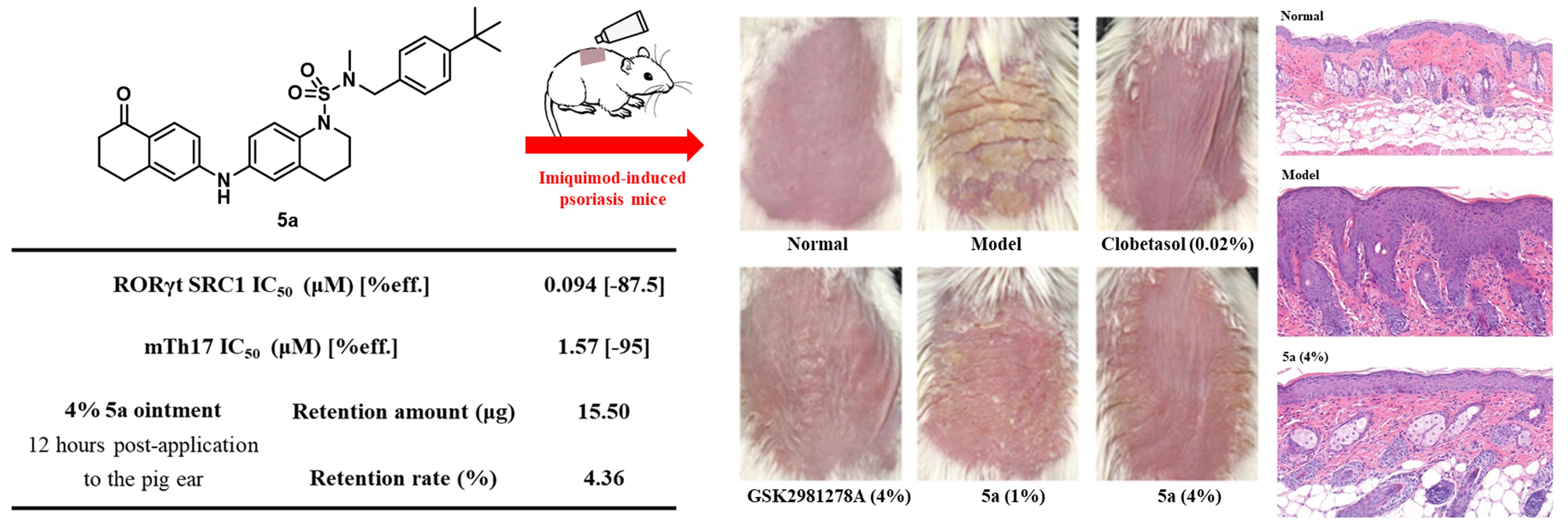 Professor Wei Fu’s team conducted five rounds of in-depth SAR studies, resulting in the design and synthesis of a series of N-sulfonamide-tetrahydroquinoline compounds. Among them, compound 5a was found to exhibit significant in vitro activity. Due to the high lipophilicity and in vitro pharmacokinetic properties of 5a, it was formulated into an ointment, which enabled effective skin retention and mitigated systemic side effects resulting from blood entry. The ointment of 5a was further assessed in the mouse model, where it demonstrated significant anti-psoriatic effects, comparable to the positive control GSK2981278. Moreover, no acute toxicity or hERG toxicity was observed for compound 5a. The study also elucidated the binding mode and molecular mechanism of action of 5a by means of molecular docking and molecular dynamics simulations, revealing that 5a exerts its inverse agonistic effect by influencing the structure and function of RORγt. The work provides an excellent candidate for the development of novel anti-psoriatic drugs.